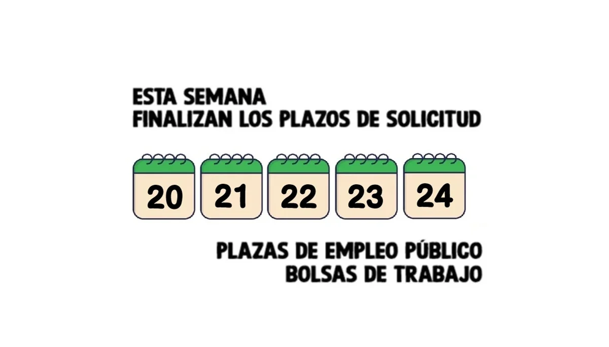 Revisa las plazas de Empleo Público y Bolsas de trabajo, cuyos plazos de presentación de solicitudes finalizan esta semana. La fecha que figura en el plazo de presentación tiene carácter indicativo: en convocatorias de la Administración General del Estado sólo se han considerado inhábiles las fiestas de ámbito nacional; en convocatorias de Comunidades Autónomas y Entidades Locales, las fiestas de ámbito nacional y de la Comunidad Autónoma correspondiente.